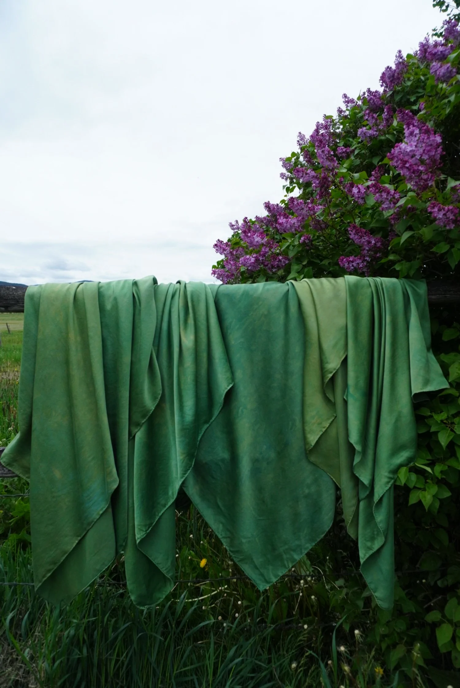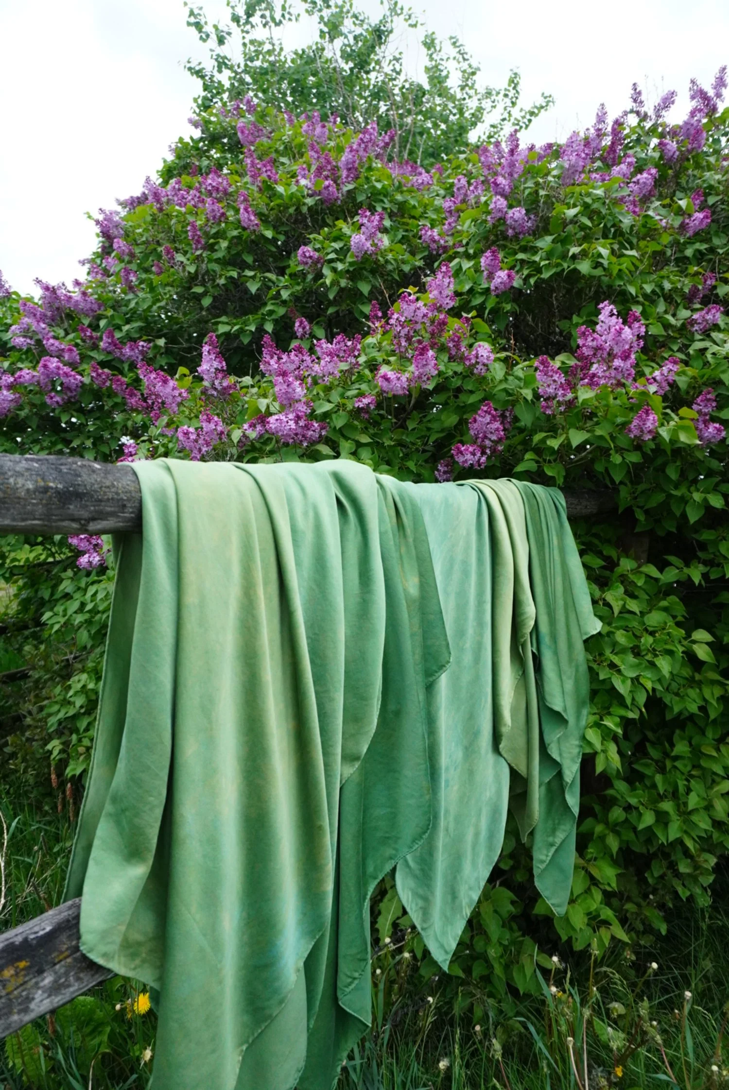 The natural dye of your wild rag is a living, dynamic hue. As such, it reacts to elements of nature, such as metals, sunlight, and acidity. To extend the longevity and vibrancy of your living color, it is best to store your scarf out of direct sunlight and to always hand wash with cold water and a small dose of liquid, pH neutral detergent. This tends to include most of the additive-free detergents commonly found at any grocery store (such as free and clear). Do not use a washing machine, as the metal patterns in the machine can stain your rag. I recommend hanging your silk to dry, although you may use a non-heated setting on your dryer. Exposing your rag to metals, particularly iron, may result in staining.