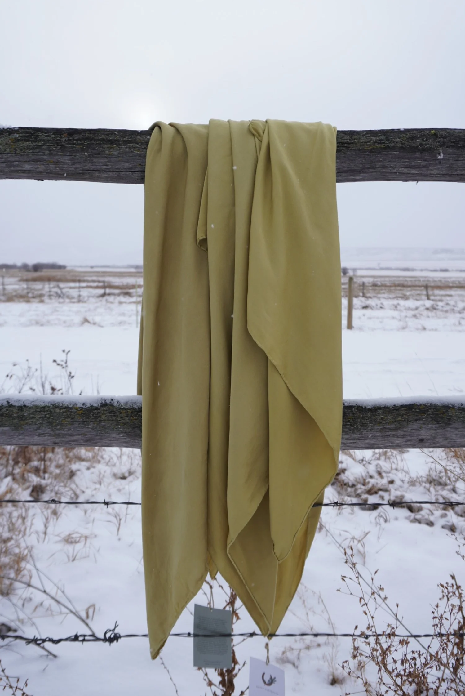 These wild rags are a subtle golden green hue. They are more subdued and have less movement than the indigo chartreuse, and are less green than the indigo olive.